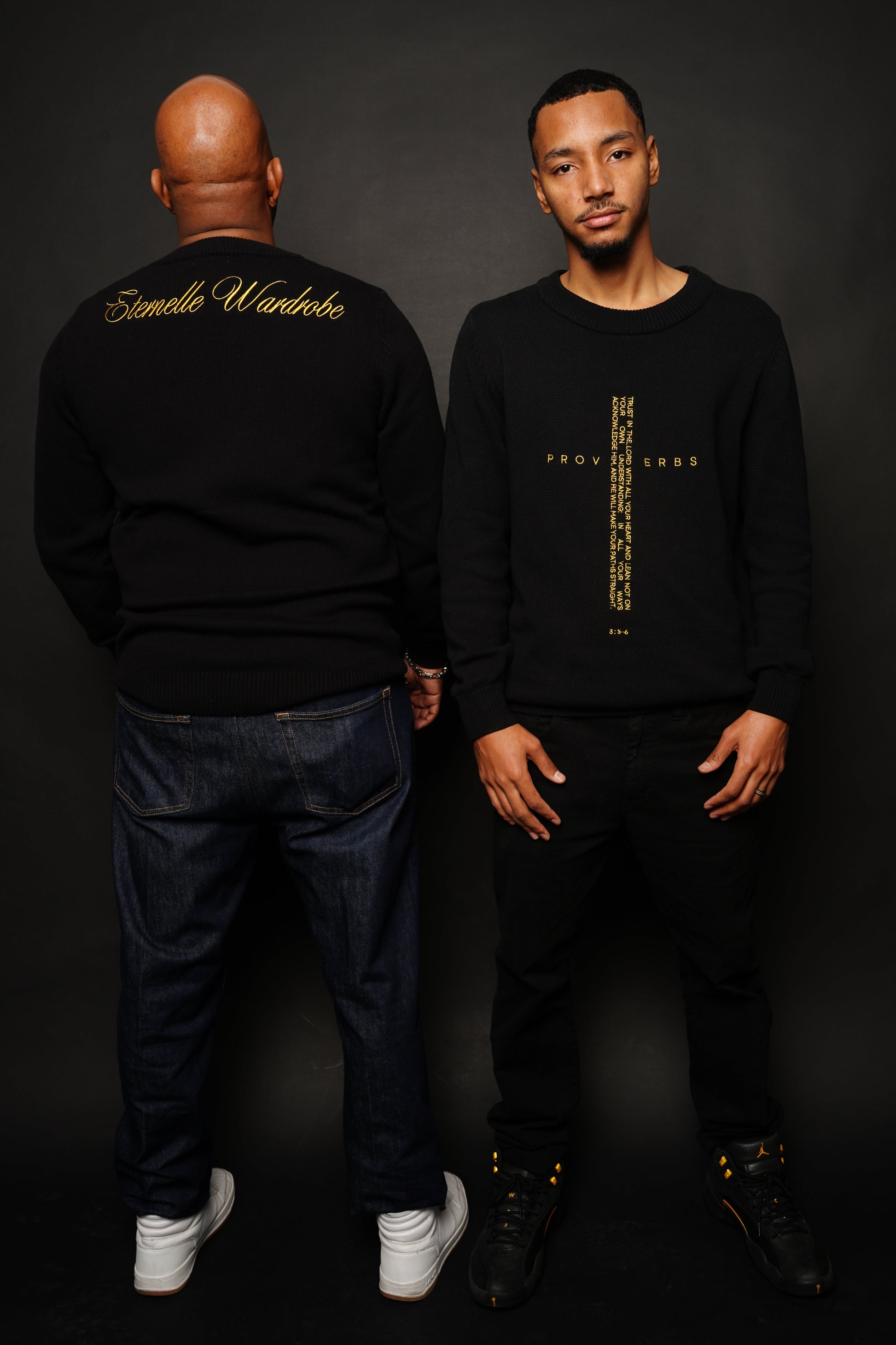 Step into bold simplicity with this statement piece from Eternelle. The front features a striking cross formed by the letters spelling “Proverbs,” followed by the entire verse — a powerful symbol of faith and identity. On the back, “Eternelle Wardrobe” sits centered at the top, a subtle mark of quality and faith-based style.